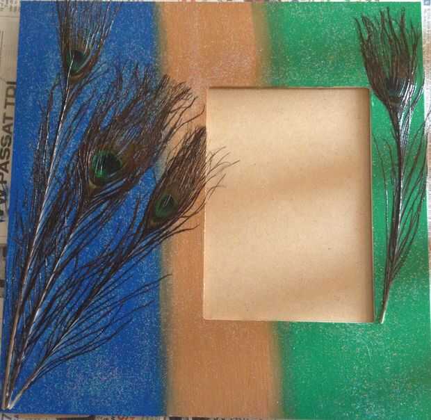 Cuadro inacabado Pintura acrílica marrón y verde, blanca, azul, oro Pinceles esponja Mod Podge Plumas de pavo real Pintura de brillo (opcional) Sellador acrílico