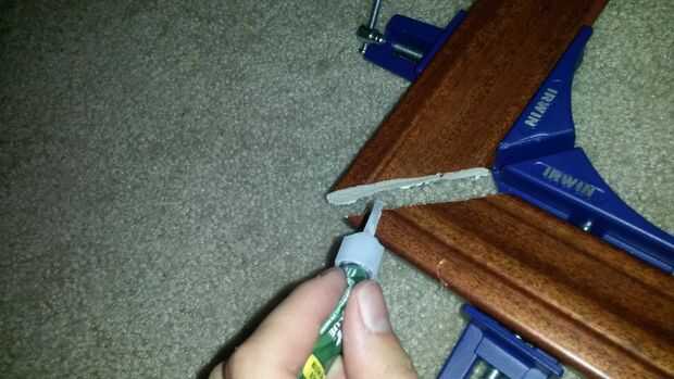 Colocar los tableros en la pinza y poner pegamento Krazy en el medio y en la parte posterior de las dos juntas para asegurar que no se rompen. Dar el tiempo suficiente de esquinas para secar entre cada maquina, no ser como yo y no esperar lo suficiente y tienen que volver a pegar.