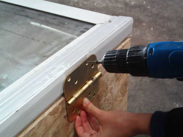 b) fije las bisagras a la base y ventana (utilice tornillos)