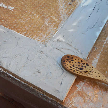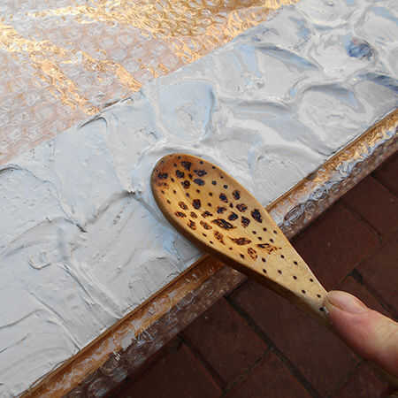 5. trabajo en pequeñas secciones a la vez, aplicar la pasta con el raspador de pintura rápidamente mojar la cuchara de madera en el agua y presione y liso para crear ondas en la pasta.
