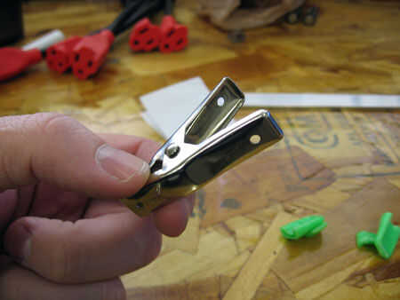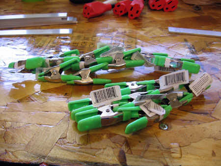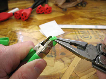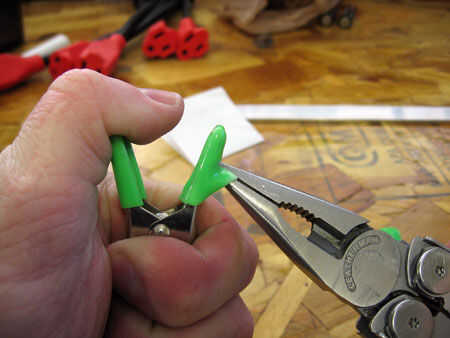 a continuación, preparamos las abrazaderas. Los que recibí de Home Depot tienen una cubierta de plástico verde neón que saqué: