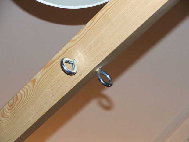 En segundo lugar, taladre los agujeros para los ojos del tornillo. Una vez más, donde les taladra depende de usted, aunque creo que es mejor tener uno en cada extremo y dos en el centro justo al lado del otro. Esto significa que tiene dos puntos de suspensión donde usted más necesita ellos y dos extra para las múltiples suspensiones de punto. También tener una cerca de la Cruz significa que es fácil atar las manos de alguien al marco mientras que está parado contra (o atado hasta) la Cruz también.