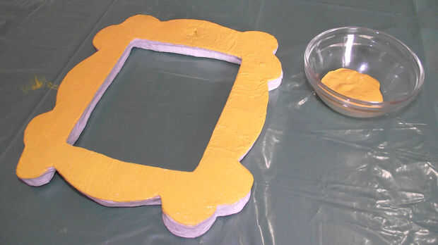 Pintar el marco entero con dos o tres capas de la pintura acrílica amarillo más oscuro. Dejar secar y luego aplique ligeramente una capa de la pintura amarillo ligera a zonas elevadas. Si no quieres amarillo usted podría pintarla para que coincida con uno de los 66 colores de la bedroooOOOmmm.