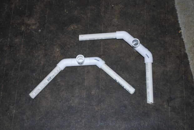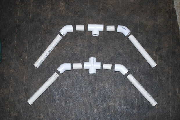 Construcción de los stands es fácil, pero mucho tiempo. Utilizando la fórmula en el paso anterior, cortar piernas de seis pulgadas de x 2 para cada soporte y unir de 2 x 1,5 pulgadas. Dry fit para la unir la instalación de T o X, agregue los codos de 45 grados, luego una pierna de seis pulgadas en cada extremo. Elegimos a seco ajuste todas las conexiones para permitir que piezas que se mueve mientras que en el techo si cualquier ajustes necesitan a realizar. También podría pegarlos.