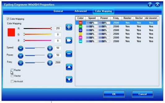 Puede hacer esto en el software de controlador de Epilog girando en Color Mapping. (ver foto) Cambie a la pestaña de Color Mapping, activar mapeo de Color con la casilla de verificación y editar los colores. Seleccione el primer color, tire el interruptor R de 255 a 0, configurar la velocidad, potencia y freq deslizadores para cortar el forro, luego haga clic en el botón Aplicar ">>>". A continuación, seleccione el color verde y cambiar la velocidad, potencia y deslizadores de frecuencia simplemente marcar la superficie de su base y haga clic en el botón aplicar.