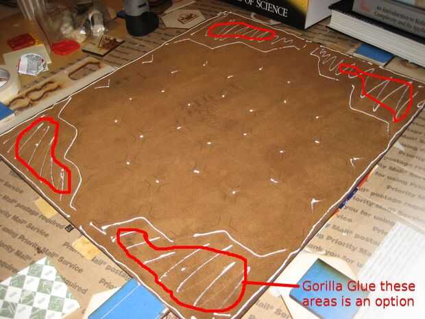 Después de la doble prueba, hacer una tira de Liquid Nails pegamento alrededor del borde del marco y poner una gota o una "X" en cada intersección hexagonal. En las "áreas abiertas", o bien aplicar más Liquid Nails, o (y te recomiendo esto) usar unas manchas de pegamento del gorila. Nota: Gorila pegamento se expande significativamente ya que se seca, por lo que no pone nada de eso demasiado cerca de las áreas que serán visibles.