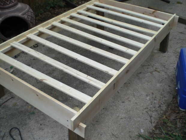 Use clavos para pegarlas sobre 2" desde la parte superior de los lados largos. Este ofrece habitaciones para que los listones, además de un poco para mantener la cama en su lugar.