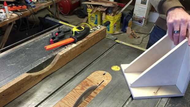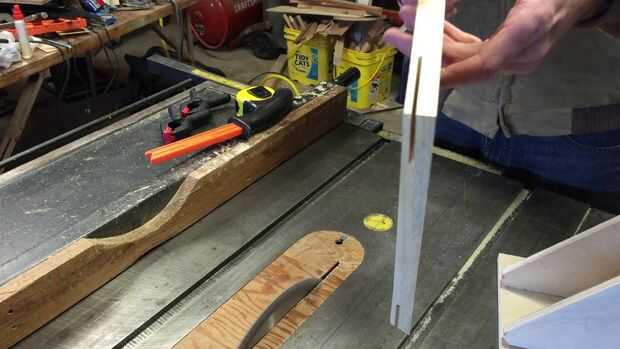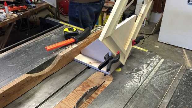 Construí una simple plantilla para cortar el marco para tiras. La plantilla consta de una base y una vertical que afianza con abrazadera cara perpendicular a la superficie de la sierra. La cara de sujeción es apoyada por refuerzos a la base. La plantilla se utiliza colocando la valla para que se alinean un marco a la plantilla sobre la parte superior de la hoja. Altura de la cuchilla se encuentra a una altura adecuada para que se corte una profundidad adecuada para aceptar una spline.