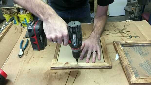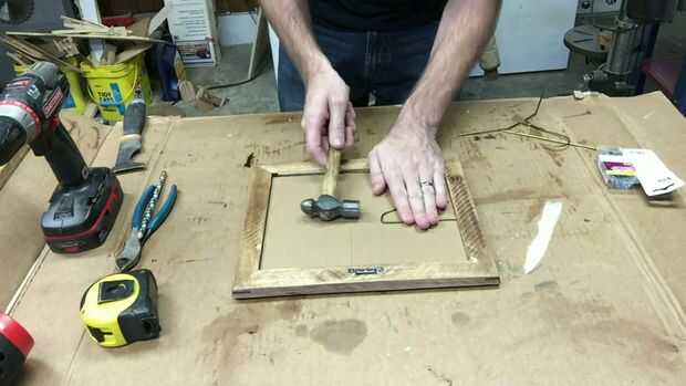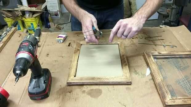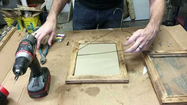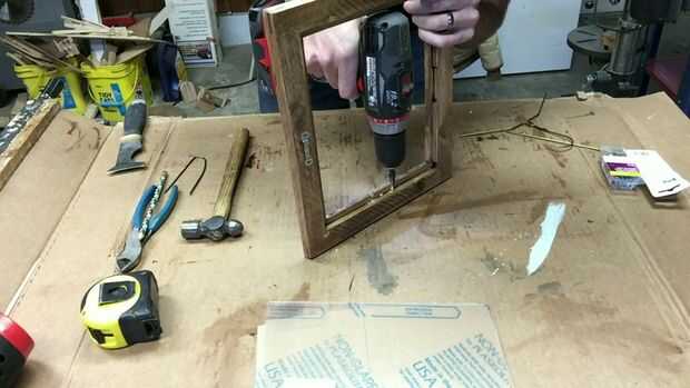 Mi solución fue cortar la esquina de una percha de alambre y doblarlo por lo que las piernas son paralelas entre sí. En la parte trasera del bastidor en el riel inferior, he marcado y había perforado dos agujeros poco profundos para que cuando la pieza de suspensión de alambre se inserta en los orificios, apoyaría el armazón en posición vertical. Para almacenar el soporte cuando no esté en uso, puse el cristal, Foto y respaldo en el marco y marcado el interior borde del marco. Entonces quité el vidrio, etc. y perforaron agujeros poco profundos en el lado de la barbilla para que el soporte se podría poner aquí si no se utilizan.