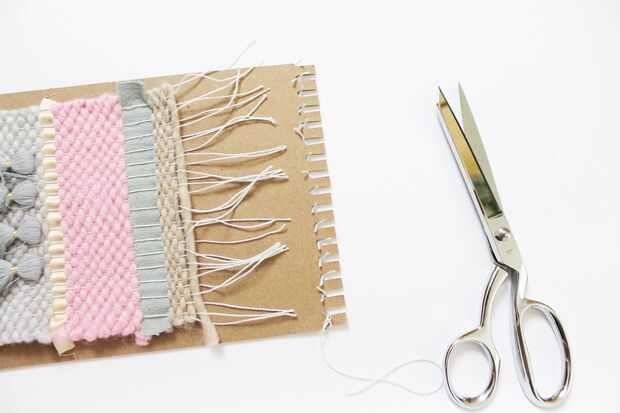 Cuando hayas completado todas sus filas cortan los hilos de urdimbre y nudos en el mismo nivel a lo largo de la parte inferior del tejido. Tenga cuidado de no apretar demasiado cuando sus nudos!