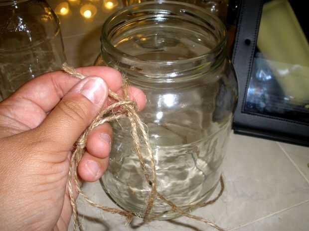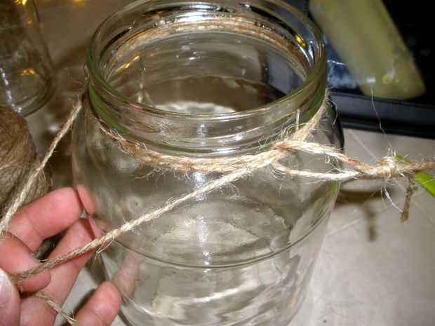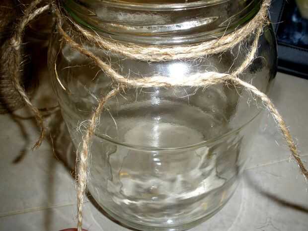 A partir de un lado de la jarra, envuelto el yute en la parte superior de la jarra, debajo del tornillo de casquillo.