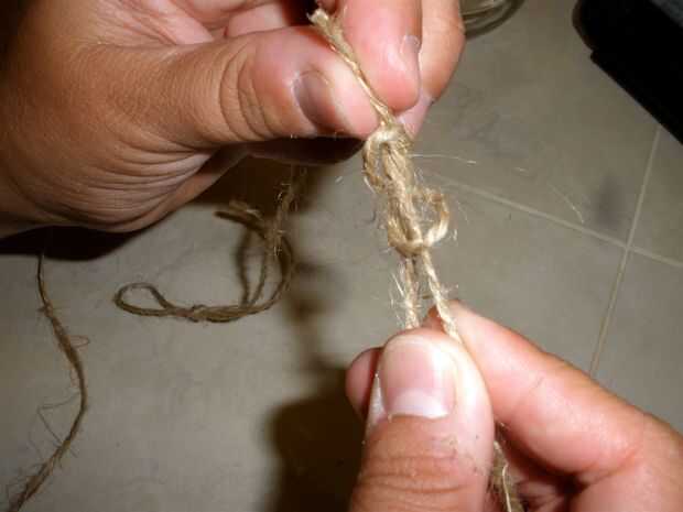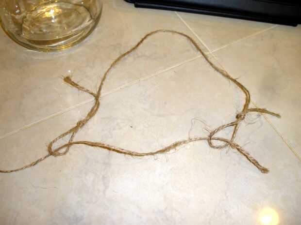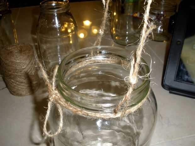 Até cada lado de las cuerdas colgantes para cada tarro con el bucle mencionado más arriba y se deslizó una segunda pieza larga de yute por los dos lazos.