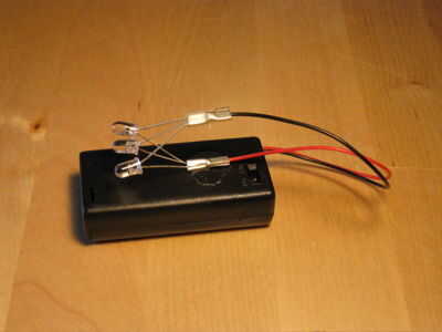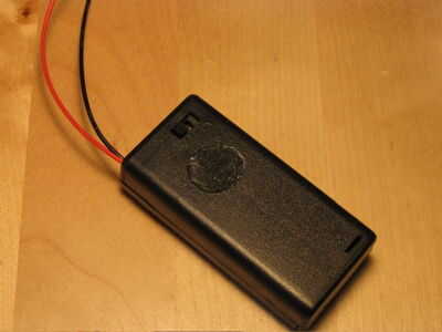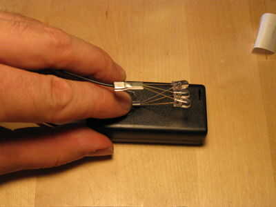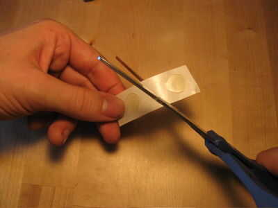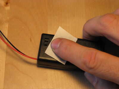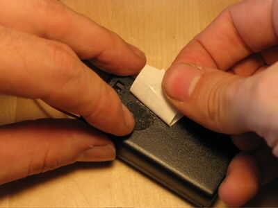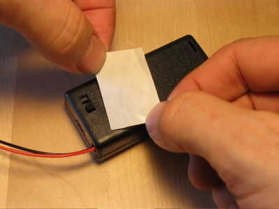 Suavemente peel la tira de puntos de pegamento abierto, teniendo cuidado de no tocar las gotas de pegamento, o conseguir pegado en nada (está como manera pegajosa). Corte el respaldo para que tiene un solo punto y péguela a la caja, cerca del interruptor.