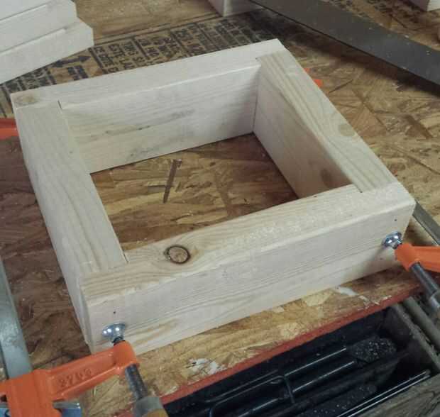 Pegamento para arriba fue rápido. Difundir un montón de cola para madera dentro de los cuatro rebajes y armar los cuatro lados. Utilice abrazaderas para sujetar cosas en su lugar mientras usted regresar con una clavadora y clavar las cuatro esquinas subiendo por debajo de la barbilla en las piezas laterales. Dar la cola 24 horas para secar antes de poner cualquier tipo de estrés en las articulaciones.