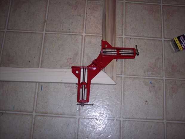 Si usted está planeando utilizar cola para madera, aplica el pegamento a los bordes de ambos tableros antes de colocarlos en la abrazadera. La abrazadera no es totalmente necesaria pero garantiza que el marco será cuadrado aunque sus ingletes no son perfectos. También sostiene las piezas juntas mientras que se está golpeando en la siguiente parte.