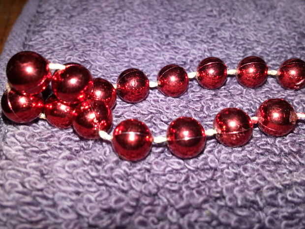 Segmento de cuatro granos. En el cable de unión de los granos superiores tuerza los segmentos. Hacer esto dos veces para aplicar la retención de la torcedura. Puede hacer giros adicionales pero usted puede romper el cable. Algunas cuentas perder la pintura durante la frotación de la torcedura tan atento si no quieres un efecto de brillo en la ropa.