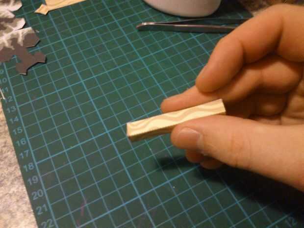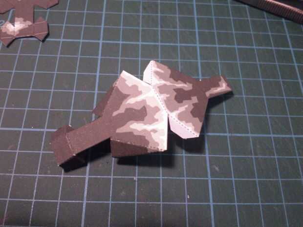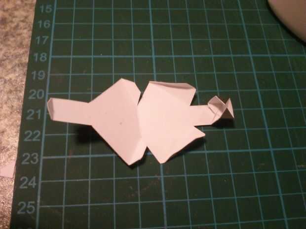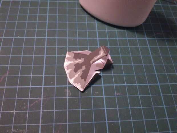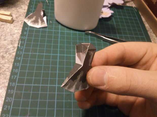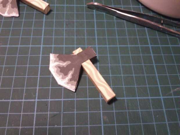 Ahora pegue los lados de la hoja juntos a lo largo del borde de corte. Espere y luego pegar las partes superior e inferior para hacer un triángulo. Dejar la solapa sin pegar así que puedes poner el mango del hacha.