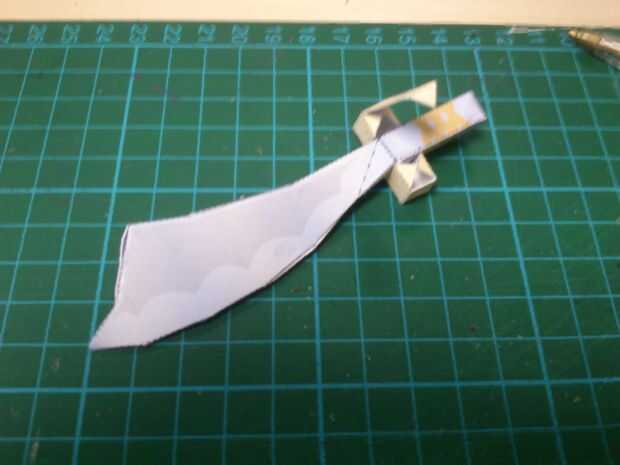Con la parte de la espada, comenzar por pegar los dos lados del borde del corte juntos. Trabajar desde la base hasta la punta.