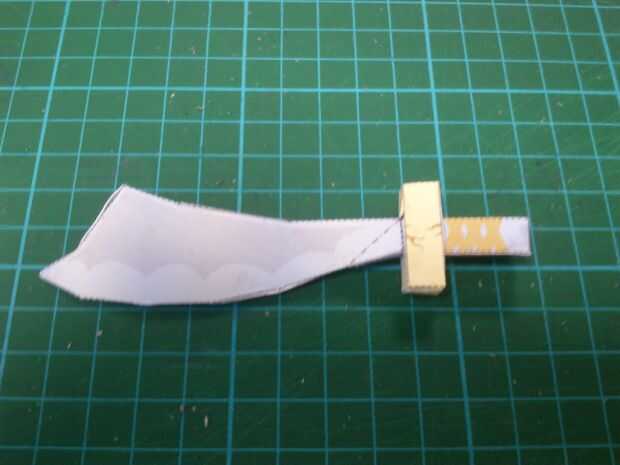 Coloque una gota de pegamento en el interior de la corssguard en ambos lados y el extremo de la aleta restante y coloque la espada dentro antes de cerrar para arriba. Asegúrese de que la empuñadura es en la parte superior de la sección rectangular o Marfusha no puede mantenerla correctamente.
