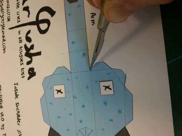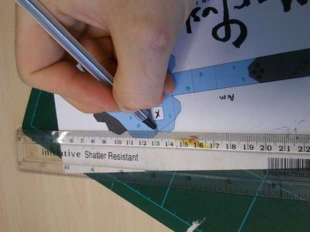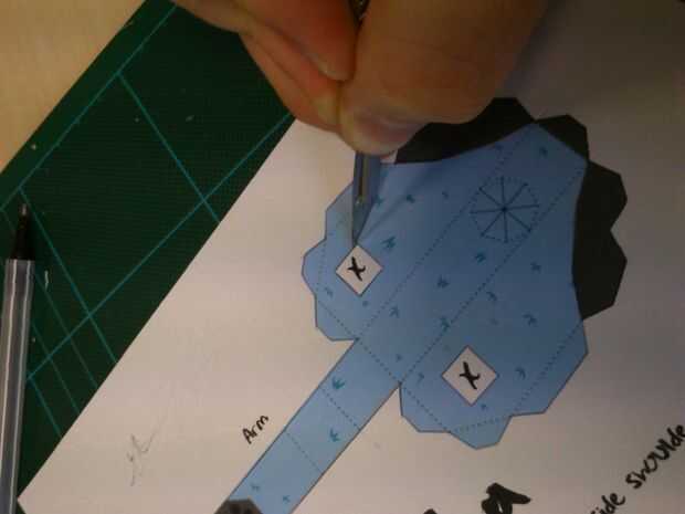 Cortar todos los espacios internos blancos marcados con una X. Corte alrededor de las líneas sólidas dentro de los brazos, hombros, cuerpo y mascarilla. Si haces esto más adelante y la navaja no es absolutamente fuerte, corres el riesgo de desgarro de la parte.