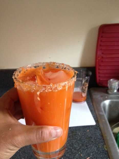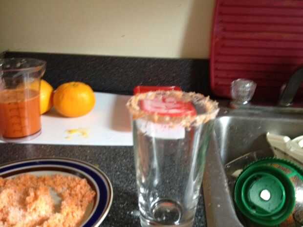 Difunda la "sal de la zanahoria" en una superficie plana, mojar el borde de su vaso y meter en la sal. Giro para que la sal se pega. Luego voltear el vaso, agregar hielo, luego añadir el cóctel. ¡ Disfrute!