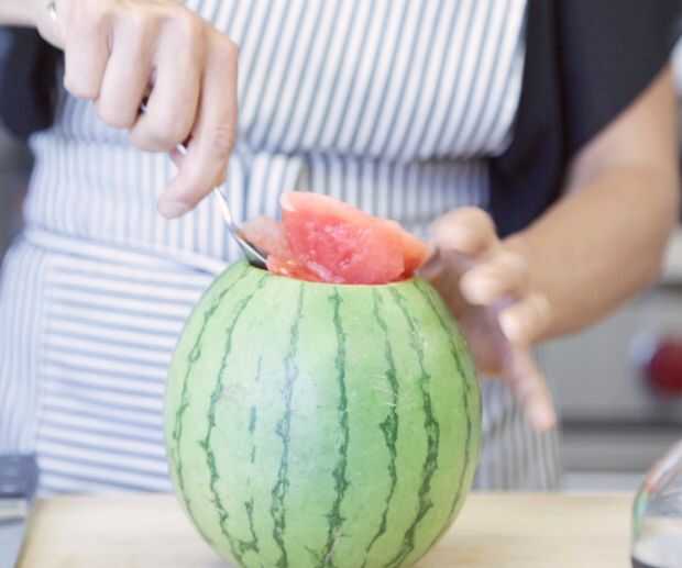 Utilizando una cucharada grande cubiertos-estilo, sacar la cantidad superior de tercera de sandía y apartar. (Úsalo en una ensalada de frutas, o como un snack para mantener su fuerza fabricación.)