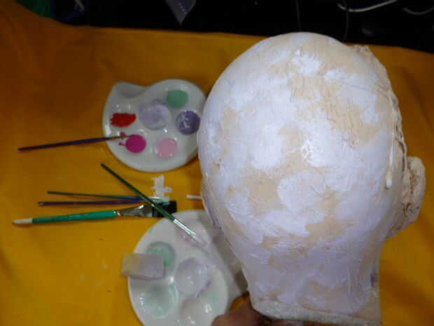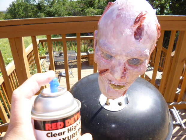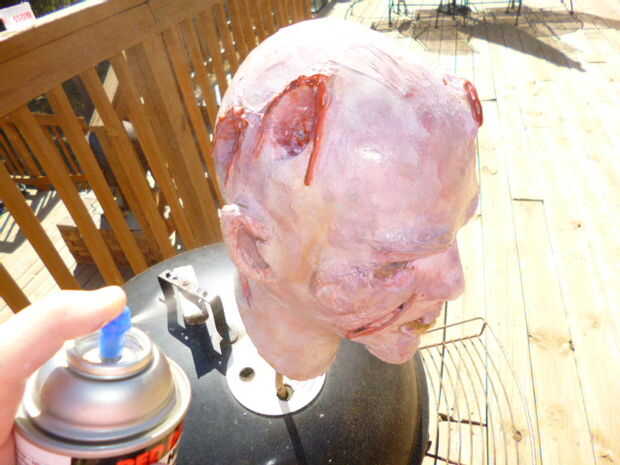 A partir de un verde claro, añadir más tonos de rojo rosado, turbia lila, azulado grisáceo, etc.... hasta que la cabeza tiene la apariencia de carne molida estropeado. Una vez seco, frote la pintura gris y roja sangriento en los puntos altos que se formaron por montones de gluegun anteriores a escapar sangre y masa cerebral.