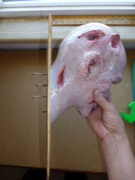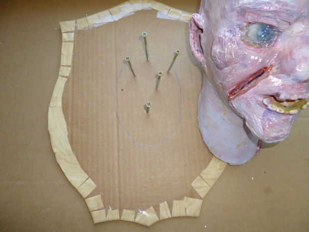 • Trazar la base del cuello en la parte trasera de la cartulina cubierta.  Sigue trabajando en la parte trasera, fije tornillos largo dentro del área de trazado y fije el cuello (de la cabeza de espuma) al frente de la cartulina cubierta.