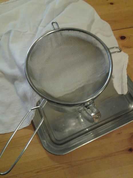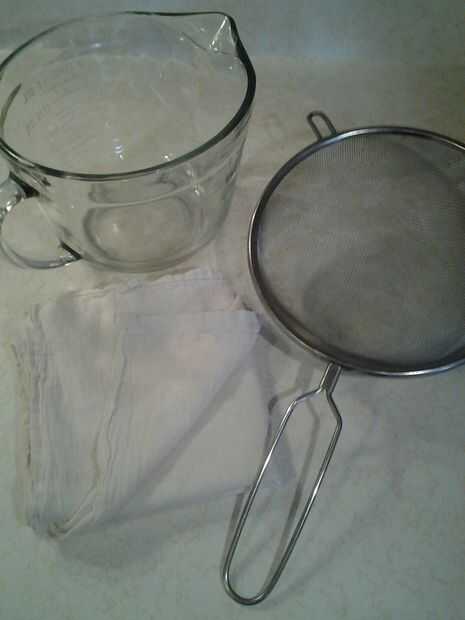 Mi filtro es armar un filtro de pantalla de la cocina, un recipiente de medición grande y un paño de cocina fino.  Puse la ropa sobre la taza de medición y colocar el filtro de pantalla en el centro. También colocar estos artículos en una bandeja para facilitar la limpieza.