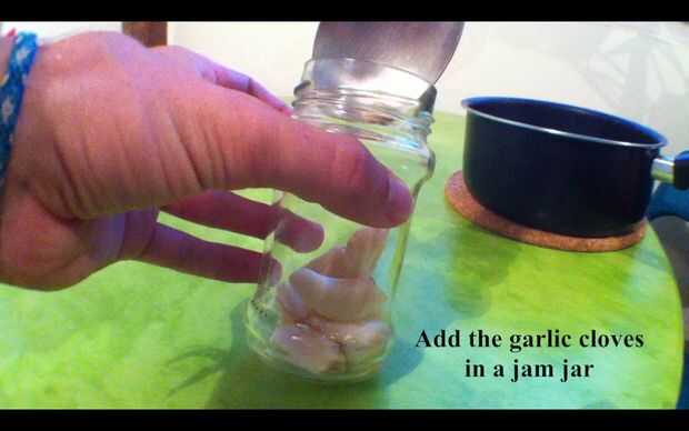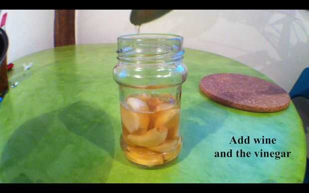 Añadir los dientes de ajo en un frasco de mermelada y llenar 2/3 del vaso con el vino y el vinagre hervido la mezcla.
