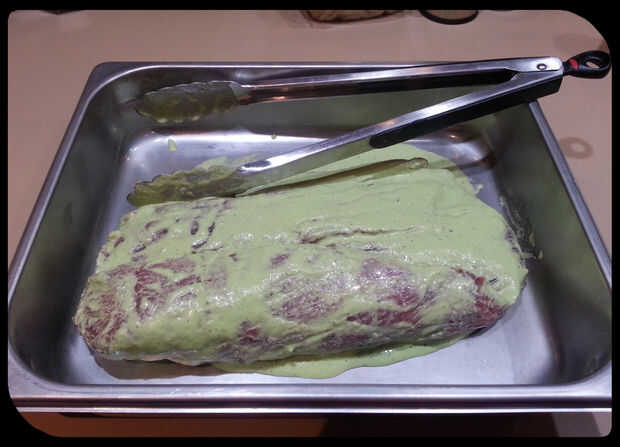 Langostinos marinados en pesto con un kataificrust.Este plato es una combinación de diversas cocinas como la cocina de Grecia en Turco, Italiano.El ingrediente secreto: pasta kataifi.Paso 1: ingredientes los ingredientes10 langostinos grandeskataific