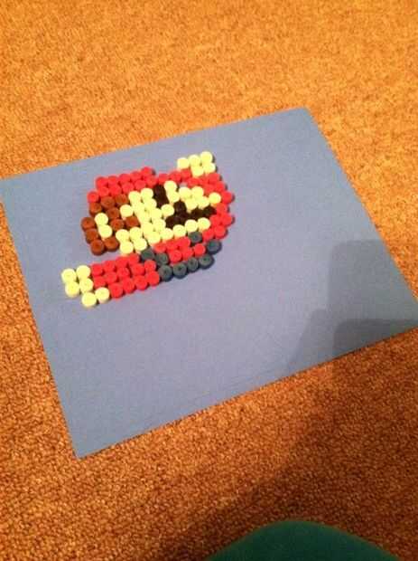 6 comenzar a pegar a su Mario abajo a partir en el sombrero. (para la parte superior del gorro, pegar cada red individual. Después de que usted puede poner una pequeña línea de pegamento para cada fila. Cualquier pieza que no tiene un color debe pegar individualmente para ayudar a mantener a Mario recto. )