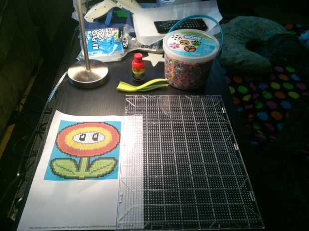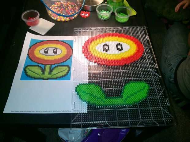 Se necesita una imagen de un Fireflower, papel encerado, tablero grande perler y cubo grande de cuentas perler, finalmente se necesita una plancha. Diseño de la cabeza Fireflower y hojas en un estilo que te gusta (fui con un aspecto más moderno). Coloque cuidadosamente el papel cera sobre el diseño y el hierro, fusionando todos los granos.