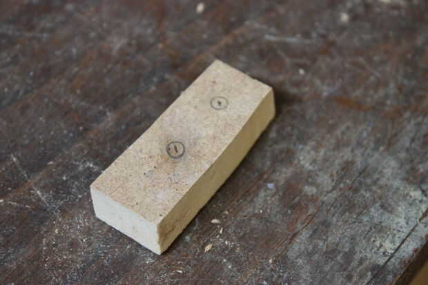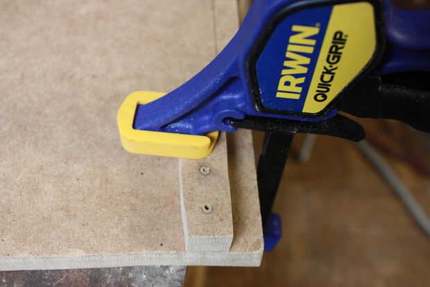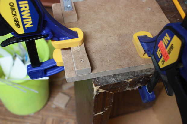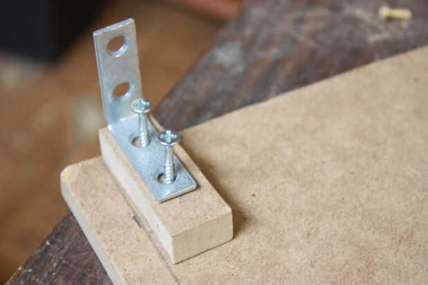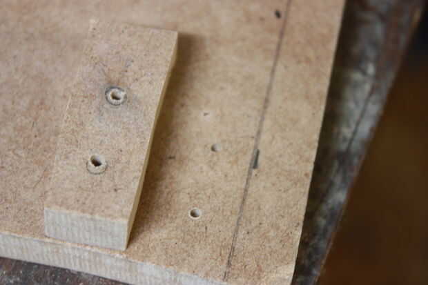 Una vez que haya perforado los agujeros a través del bloque, utilice un destornillador, coloque la rodillera de L sobre el bloque y atornille dos #6 1" tornillos hacia abajo hasta que vea un poco pequeño de él sobresalen. Eso hará más fácil de encontrar y montar en el tablero de 6 x 7. Alinear el bloque con los tornillos para el tablero de 6 x 7. Una vez alinee, utilizar un taladro o destornillador y fijarlo todo el día. Repita con el 2 º bloque en el extremo opuesto en el mismo tablero de 6 x 7. Monte el tablero de 6 x 7 a la placa principal por medio de abrazaderas de las esquinas. Cuando se monta el 6 x 7, alinear la parte superior de 6 x 7 con la parte superior de 7 x 7 por lo que convergen y forman una esquina perfecta. Cuando están alineados, círculos de rastro en el 7 x 7 donde esté en contacto con el soporte de L. No perfore todavía.