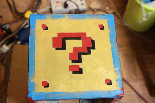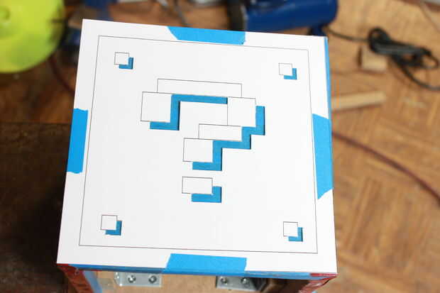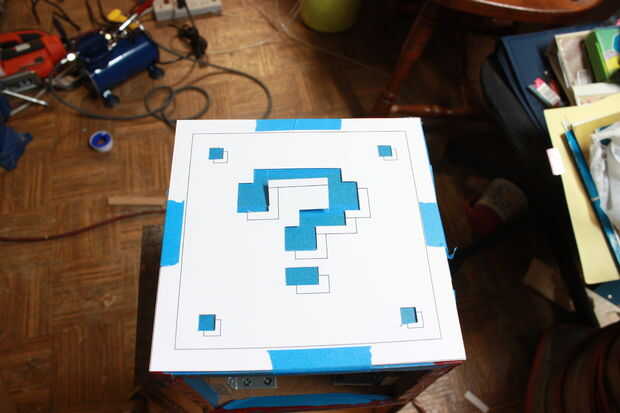 Cuando se seca la pintura oro, retire la capa de 'top' cinta una junta entonces volver a la cinta el entero 7 x 7. Coloque la plantilla de signo de interrogación sobre y trazar otra vez la capa superior con la maquinilla de afeitar. Esta vez, en lugar de mantener la capa superior, retire cuidadosamente la capa superior y luego la aerógrafo con pintura roja. Que todo lo seco y cuidadosamente retire todo nuevo incluyendo la capa inferior.