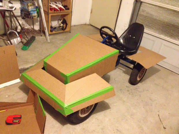 Ahora que has clasificado, corte y doblado sus piezas, con cinta los bordes juntos. Si las piezas no son muy del tamaño correcto o forma para montar en vehículo ajuste las piezas ahora para conseguir un buen ajuste. Usted puede hacer ajustes según sea necesario para el patrón. Como veis en la foto, empecé con un parachoques trasero sólido pero eventualmente creó dos topes separados porque pensamos que parecía mejor. También tuve que recortar los lados de la campana para montar en vehículo. Cuando esté satisfecho con la forma de su chasis extraer las piezas del vehículo y guárdelos.