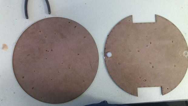 Dibujar las bases del coche en CorelDraw o cualquier software que te permite cortar el MDF con un cortador láser. Usted puede utilizar cualquier forma que desee; hemos decidido hacerlo redondo al solo uso de dos ruedas. Y dos niveles para poner las armas en la parte superior.