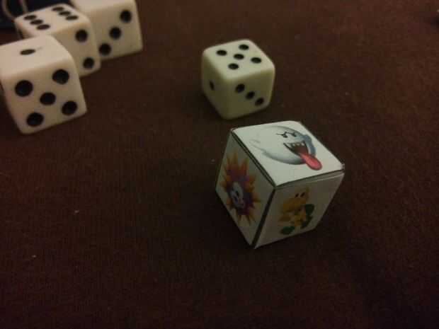 Se trata de la misma idea en cuanto a los dados y tablero. Sólo imprimir y cortar los cuadrados. El archivo tiene 3 copias, pero sólo necesitas uno. Pegar uno a cada lado de los dados.
