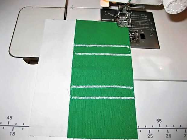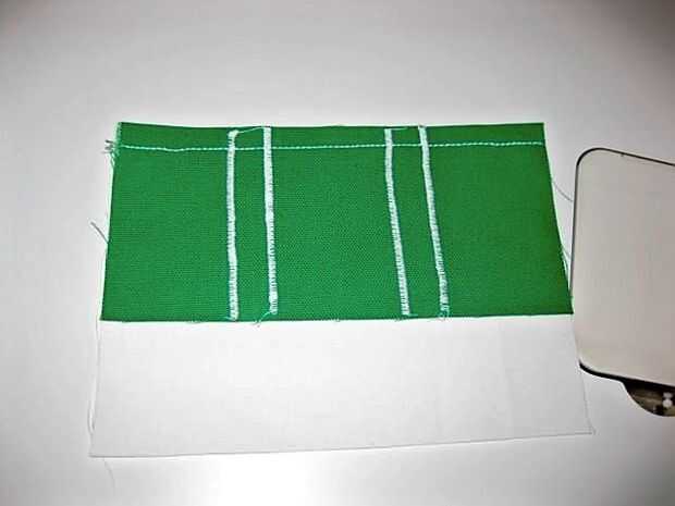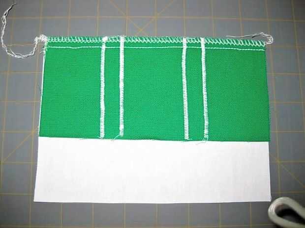 A continuación, coloque la cara verde hacia abajo en el blanco y coser la costura de 1/2 pulgada del borde a través de todo el camino. Nuestra máquina tiene la opción de triple puntada. Si no tienes en tu máquina, coser la costura doble. Para soporte adicional y durabilidad, se utilizó una máquina de coser remalladora para terminar la orilla. Si no tienes uno, no te preocupes, es sólo una capa extra de durabilidad, pero no necesario.