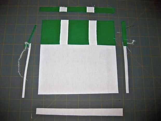 El frente está ahora completo menos las plazas de botón amarillo y la letra para ser cosido en. Tiempo de ajuste para arriba y volver a 7 x 7. Cortar uniformemente las correas terminan todavía centrada en el ser y los extremos son cuadrados. Desea que la parte inferior blanco o rojo que 4,5 pulgadas y la parte superior para ser de 2,5 pulgadas (verde o marrón). Véase el cuadro