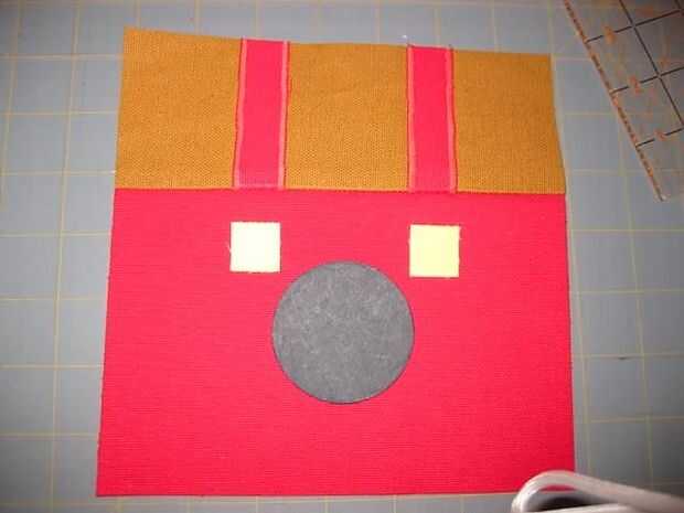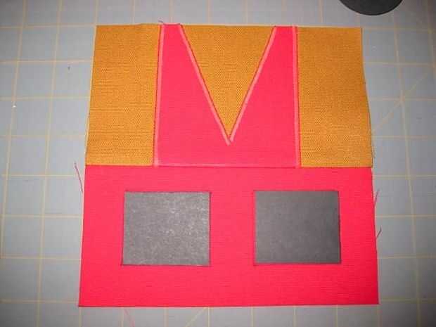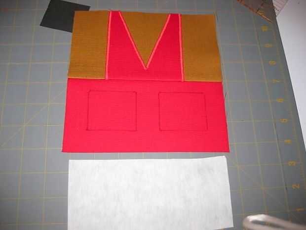 El M Mario era ser cosida sobre un fondo blanco para ayudar a ver mejor. Esto significó primero cortando un círculo de diámetro blanco 2,25 pulgadas de la tela del pato blanco, coser alrededor del exterior con la puntada, luego coser a través de dos capas con la puntada más ancha para los M. Necesita calor y bonos aquí como el círculo quiere desentrañar como coserlo.