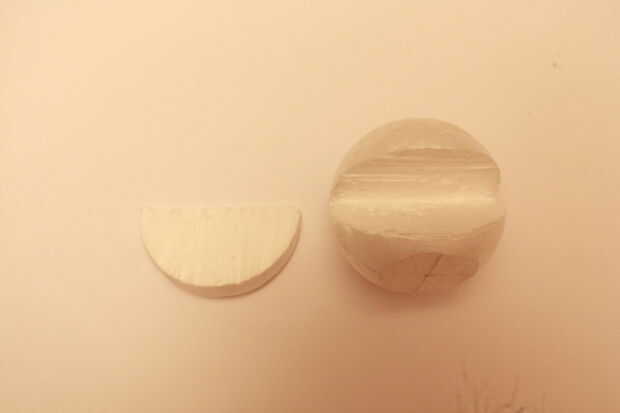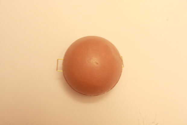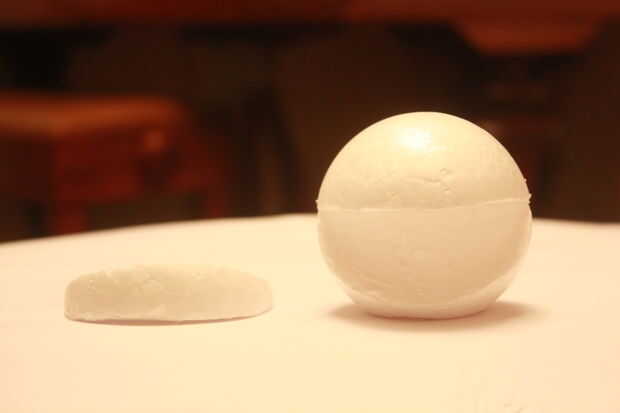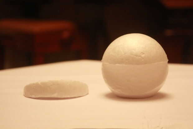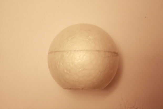 1. tomar la pelota de espuma de poliestireno y dibuja un círculo con un diámetro de 4 cm sobre él. Corte este círculo con el cortador de la espuma de poliestireno. Esta parte plana se pegan en el cuerpo.