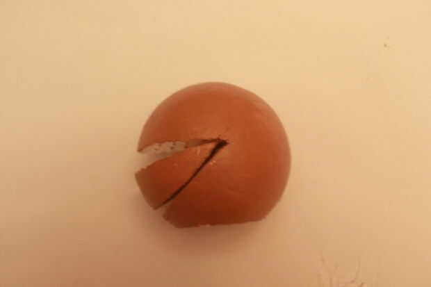 3. con el cortador de espuma de poliestireno, corte una cuña fuera de la bola cortando por la línea de en medio, entonces corte diagonalmente hacia el exterior. Mantener esta cuña; se convertirá en la barbilla.