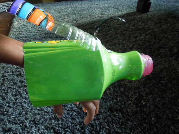 Ahora, pega su mano a través de la abertura y pegan los dedos a través del orificio. Los dedos son las piernas de la marioneta. Te recomiendo llevaba un guante negro, al hacer esto porque luego se ven más como error las piernas en lugar de dedos normal.