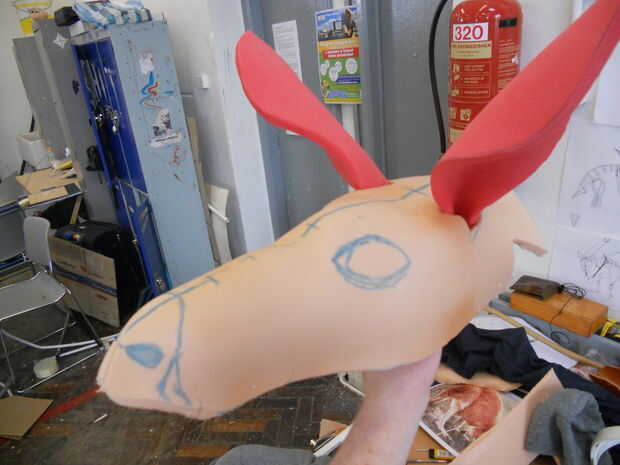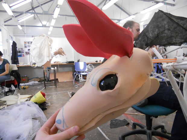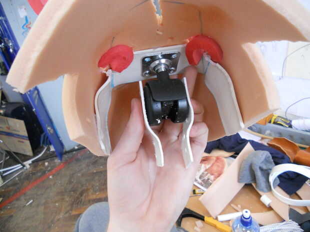La cabeza era difícil de forma correcta. Utilizando una hoja de espuma de zote que era vacformed tubo arrugado hasta darle la forma general de la cabeza de canguros. Después de conseguir una forma general usé la pistola de calor para estiramiento y flexión de la espuma en una cabeza más creíble. Negro hojas de estireno fueron vacformed y para los ojos que eran ranurados dentro de la cabeza. la plataforma del cuello fue realizada utilizando una rueda de una pata de la mesa. la rueda fue atornillada en el interior de la cabeza y atada a la punta del tubo flexible espina dorsal.