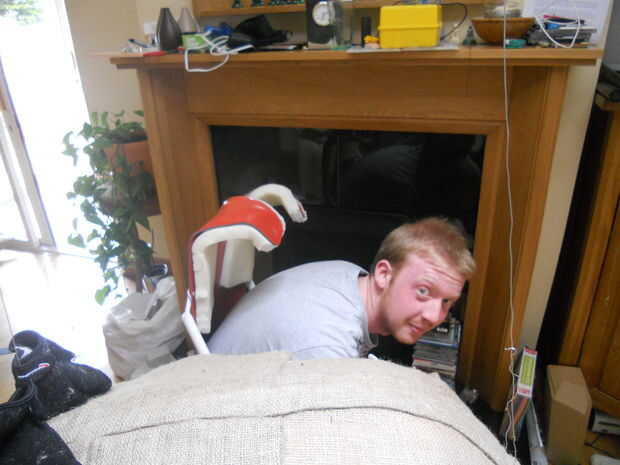 Otro problema que tuve fue con la plataforma, hecha originalmente para el canguro. Después de aplicar la cabeza, brazo y columna vertebral en el torso, ahora era demasiado pesado y difícil de mover. La plataforma comenzó a cavar mi espalda después de 5 minutos, controla el muñeco así se construyó una nueva plataforma. Este nuevo desarrollo fue un arnés trasero que distribuir el peso completamente alrededor de la parte posterior para que no cuele cualquier músculos. La plataforma se hace de una gran pipa que fue dividida y calor asesinado y presionado a mi espalda para hacer un molde de la forma de mi espalda. Dos tubos en mis caderas fueron atados a los canguros, estos también fueron reforzados por otros dos tubos. El arnés está atado a mi espalda con 2 cinturones con cuerdas de amortiguador auxiliar adjunto a la marioneta lo que le da más equilibrio. La cola fue hecha usando espuma zote donde utilicé una pistola de calor para doblar a forma y adjuntar a la parte posterior de la plataforma. Para los materiales usé del hessian para recubrir el canguro. Este material deshilachado, así que para evitar que se caiga, fue pegado a la estructura esquelética.