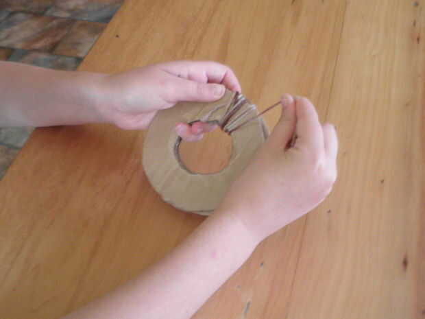 Ponga los dos anillos juntos y comienzo envolver la lana alrededor de los anillos por ir en el interior del anillo y entonces alrededor del borde por medio del anillo y una y otra vez, a menos que sea una cabeza muy grande necesitará cortar algunas lanas después comenzar enrollándolo alrededor porque todos la costumbre de lana quepa dentro anillo.