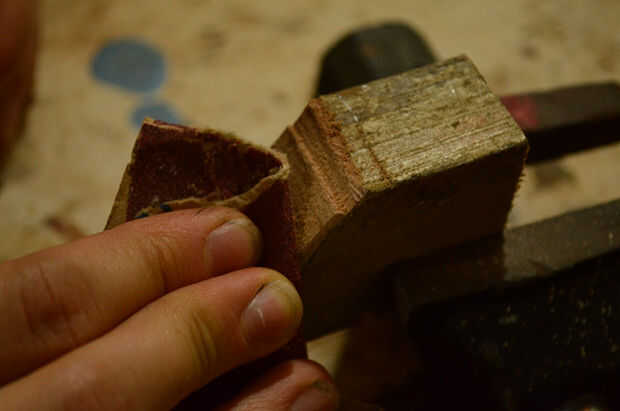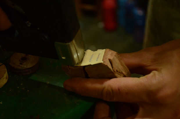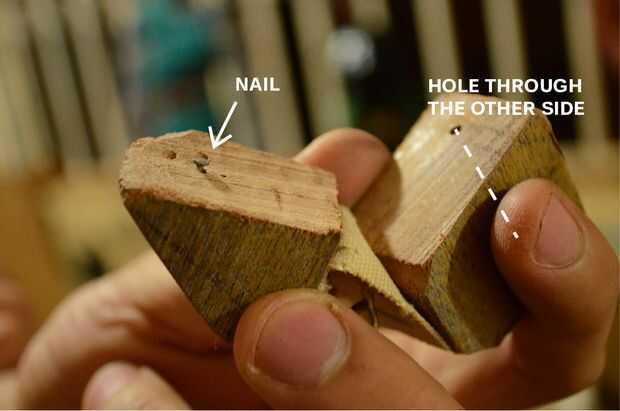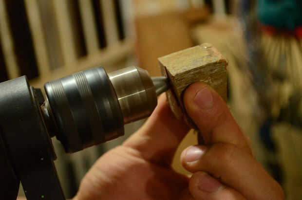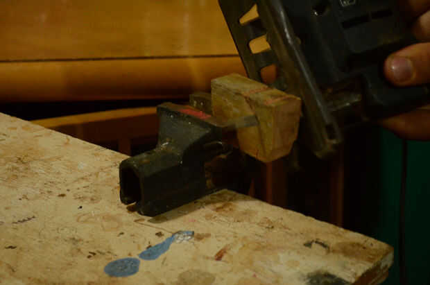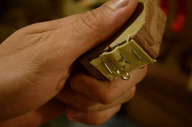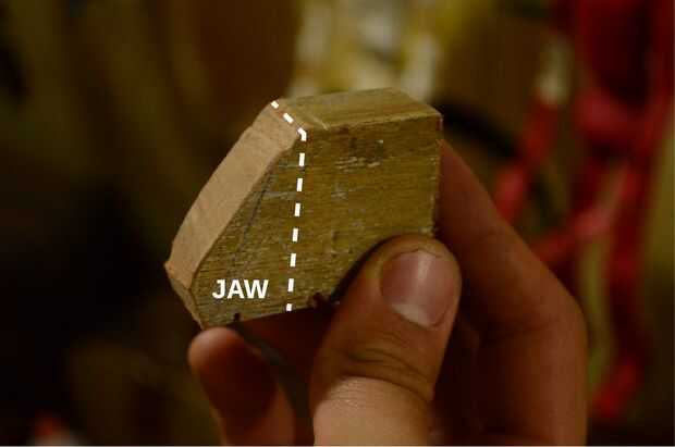 Vio un pedazo de 2½ x 1½ x 1 pulgadas para hacer la cabeza. Corte un triángulo de fuera de él, como en la imagen y los bordes de la arena. Luego dividir el polígono resultante en el 2: la parte más pequeña será el movimiento de la mandíbula. Únete a las 2 piezas de la cabeza por la perforación de un pequeño pedazo de tela gruesa.  Añadir un gancho de tornillo en la parte posterior. Perfore un agujero en la parte superior y poner un clavo en la mandíbula. Poner un gancho de tornillo en la parte superior de la cabeza.