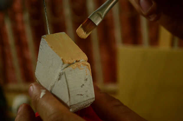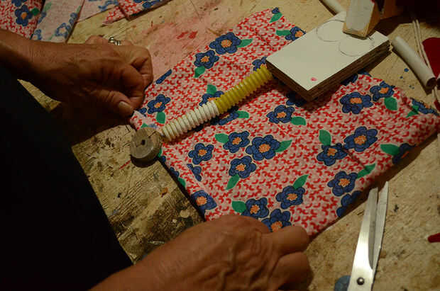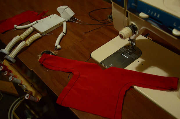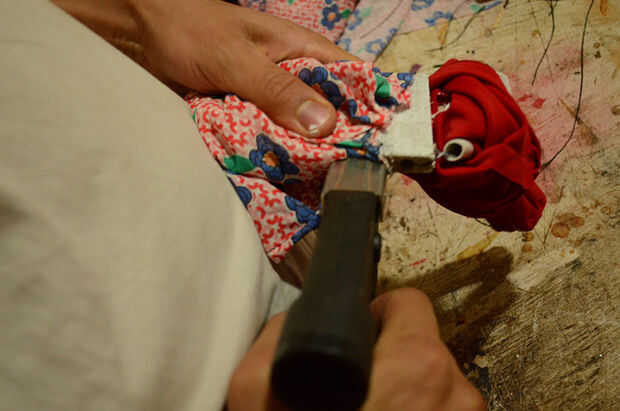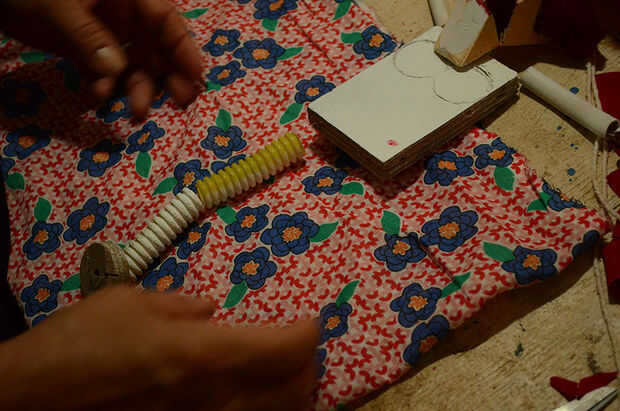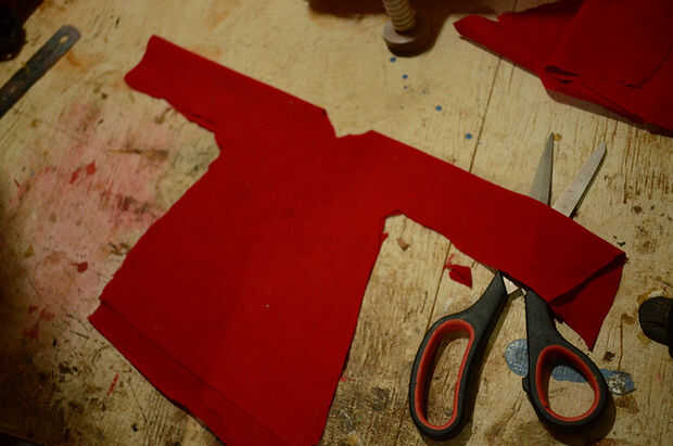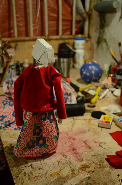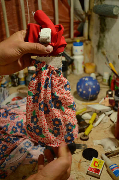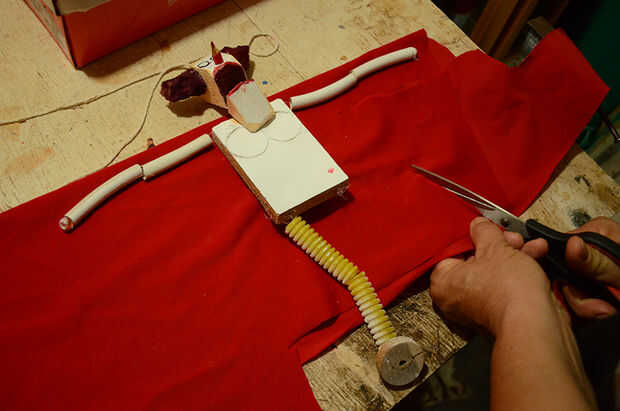 Use the puppet as a mold to cut the fabric. Hicimos una camisa de manga larga y una falda larga, para las piernas y brazos todos cubierto. Usted puede hacer un collar o no. Por ahora, la falda es sólo un trozo rectangular de tela. Coserlas con una máquina de coser o a mano si no tienes uno. La falda de la grapa en el cuerpo de la marioneta que hace pliegues y vestir el muñeco con la camiseta. Sin cuello, sólo tienes que hacer un pequeño agujero en la tela con el gancho de tornillo (esta forma es mejor a veces, porque la camisa no cae hacia los lados). Pintar la cabeza el color que desee. Se secará mientras ligamos la marioneta a la Cruz utilizada para su control.