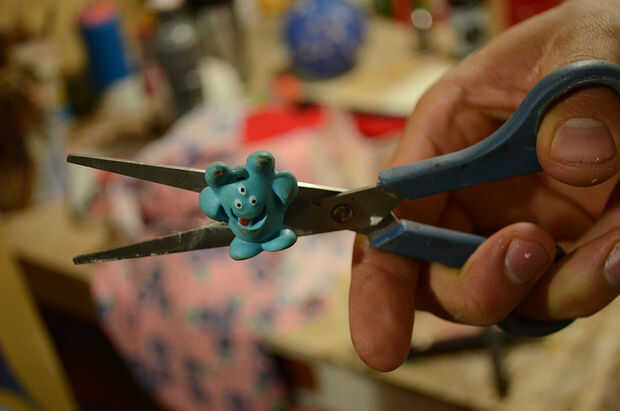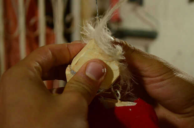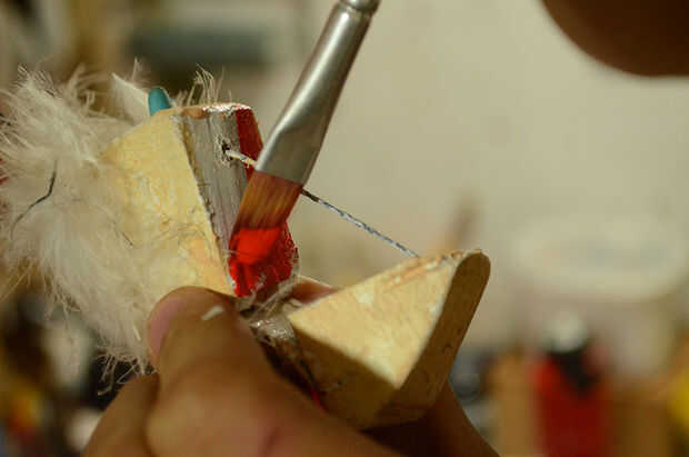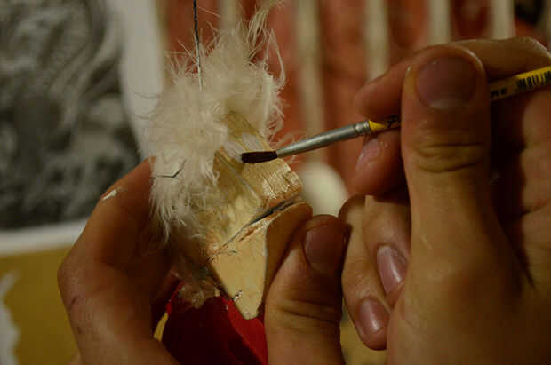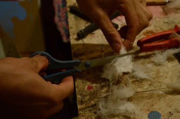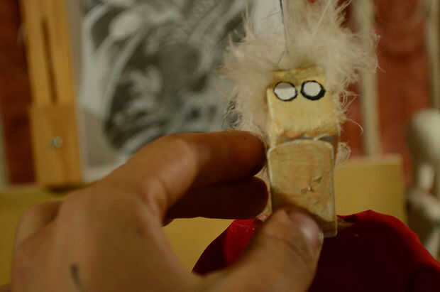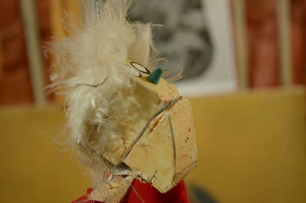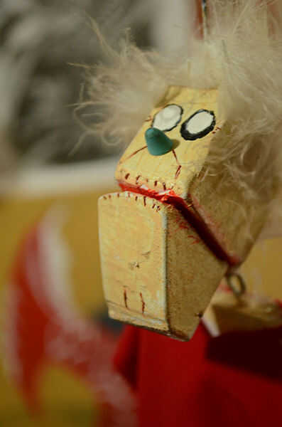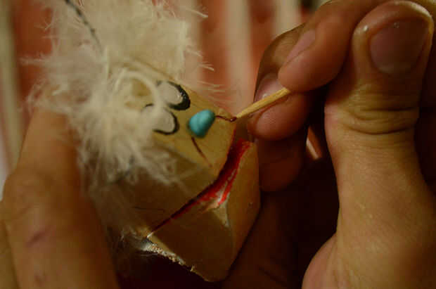 Time to finish the puppet! Utiliza plumas pegadas con pegamento caliente para el pelo, una cola de juguete a la nariz y pinta la cara y la boca con la pintura de tela. La pintura de la cara es el momento de dar a la marioneta de su expresión facial. Los materiales de acabado dependerá mucho su propio estilo y en que materiales tiene a mano y desea utilizar. Siempre es bueno recordar que podemos utilizar materiales repurposed, cosas que no usamos ya o buscar en los escombros. De esta manera ayudamos a conservar el medio ambiente donde vivimos!